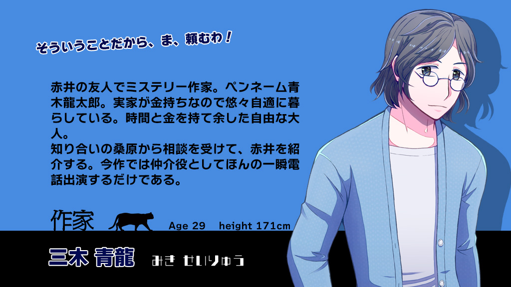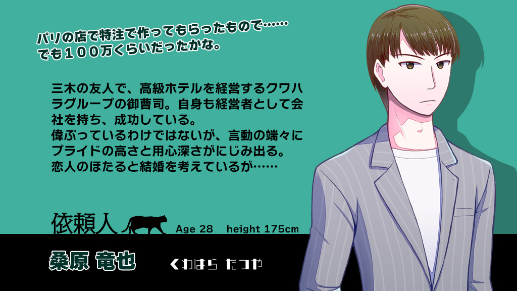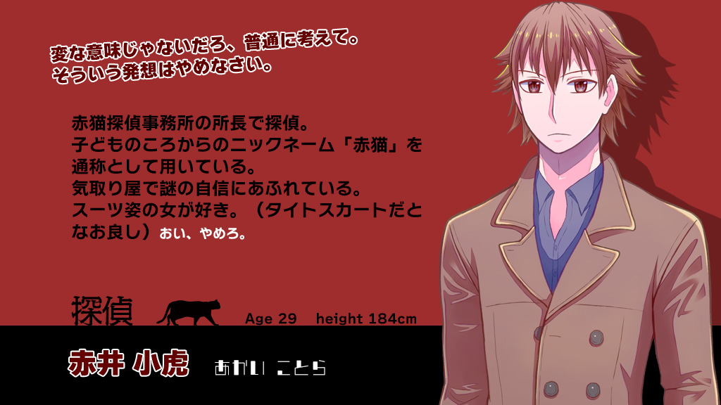 赤猫探偵事務所の所長で探偵の赤井小虎のもとに、友人の三木青龍に紹介されて青年実業家の桑原竜也がやってきた。
